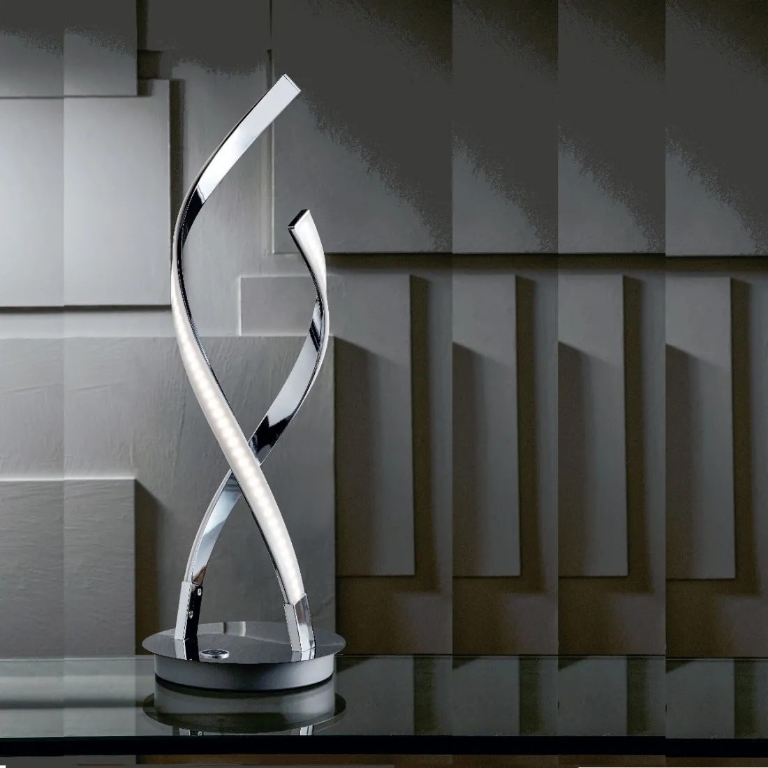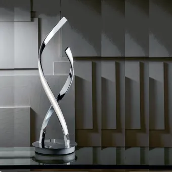 Struttura in metallo cromo lucido. Diffusore acrilico bianco a copertura della striscia a led. Una presenza elegante e delicata: la lampada a led da tavolo NEBULA è formata da due elementi luminosi che si attorcigliano intorno alla base rotonda. La luce emessa è calda con DIMMER integrato cioè che si può regolare l'intensità di luce a nostro piacere. L'abat-jour è ideale per uno stile moderno adatto ad ogni stanza della casa con un'emissione di luce diffusa.