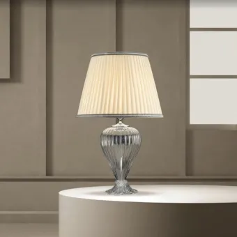 Un elegante vaso in vetro soffiato finemente lavorato a scanalature, prende luce per mezzo di un paralume in tessuto plissettato. La collezione TEODORA rendono un raffinato complemento d'arredo adatto a vari tipi di utilizzo. Le finiture metalliche in cromo lucido o dorato lucido arricchiscono con la ricercatezza dei dettagli la lucentezza dei riflessi.