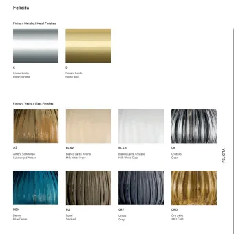 Struttura in metallo dorato per il vetro: ambra sommerso (AS), bianco latte avorio(BLAV), oro 24K (ORO), oppure struttura in metallo cromo lucido con vetro bianco latte cristallo (BL.CR), cristallo (CR), denim (DEN), fumè (FU) e grigio (GRY). A richiesta combinazioni diverse dalle nostre.