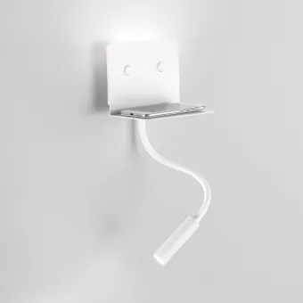 Applique moderno pratico e funzionale grazie al braccio flessibile da orientare secondo le proprie esigenze. Una lampada da parete dalle molteplici funzionalità, una luce di cortesia che non disturba, un faretto da orientare per esempio per la lettura, l'attacco USB che permette di poter ricaricare il telefonino e una piccola mensola che sopporta l'appoggio di accessori.