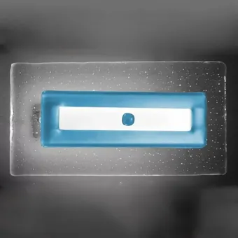 Diffusore trasparente con bolle realizzato mediante lavorazione in vetrofusione, un particolare procedimento ottenuto attraverso la classica fusione di sabbia silice, soda, calcare o carbonato di calcare e tutti i vari minerali per dare le varie colorazioni al cristallo puro. Vetro centrale azzurro.
