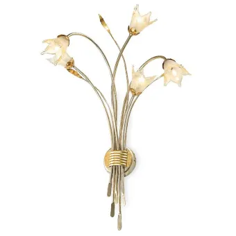 Applique da parete classico e fine nella sua forma slanciata. Un modello floreale semplice ma decorativo. Una lampada da parete lavorata interamente in modo artigianale rifinita da vetrini invecchiati di colore ambra o cristallo-oro. Made in Italy