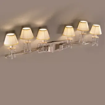 Lampada da parete classica ed elegante, uno stile che arreda e cattura lo sguardo dovunque si collochi. Una luce omogenea, calda e familiare. Un'applique rifinita da paralumi in tessuto e gocce di cristallo. Made in Italy