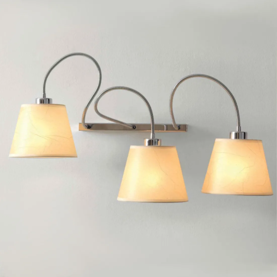 La lampada da parete è modello classico moderno grazie ai paralumi in pergamena e i bracci flessibili in modo da direzionare la luce dove si preferisce. L'applique può essere inserito in vari ambienti come corridoio, soggiorno, camera da letto, cucina, sala da pranzo, ecc ... Una luce diffusa per un ambiente caldo e accogliente.