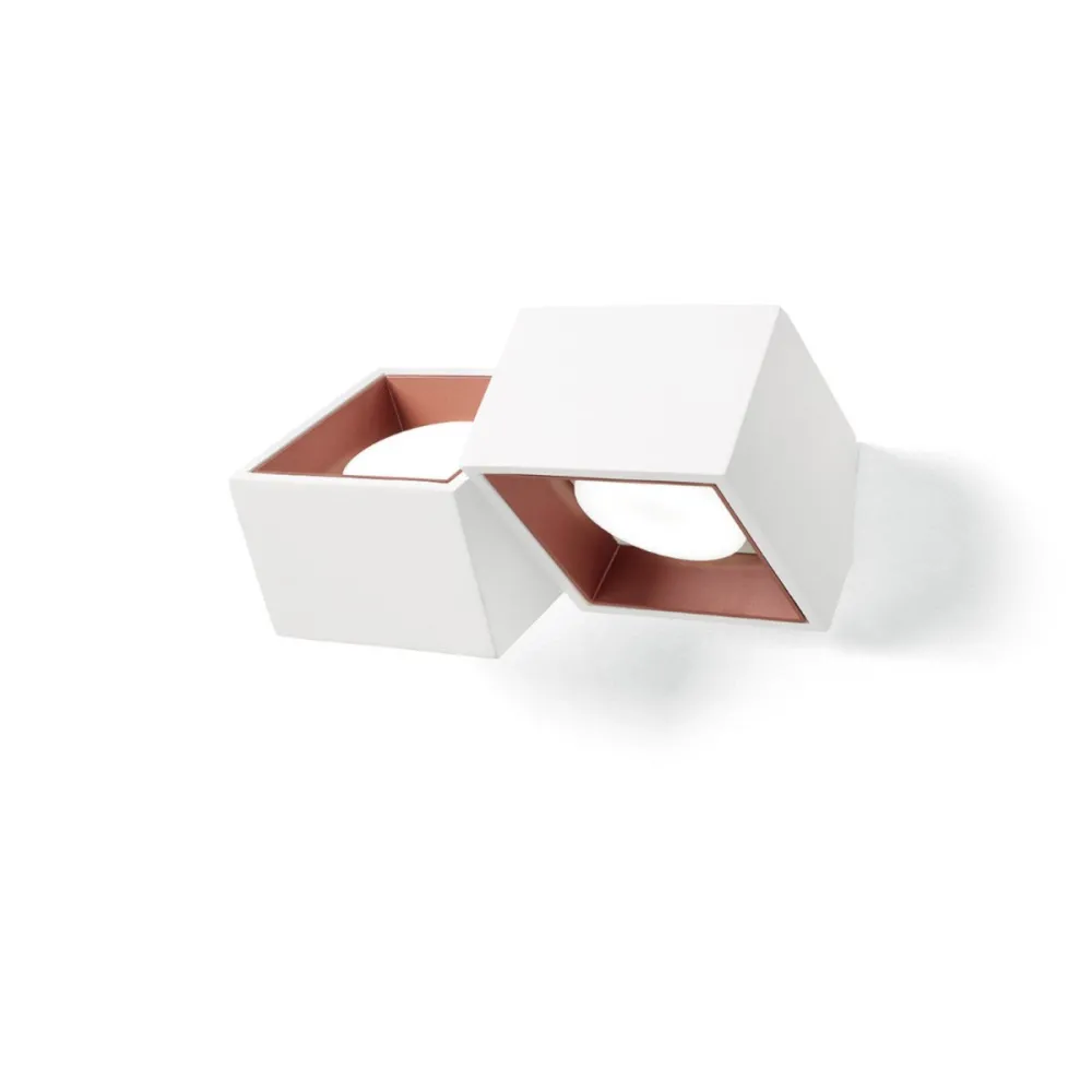 Die quadratische Leuchte NASSO AP2 besticht durch ihre unregelmäßige Form aus zwei Quadraten – eines nach oben, das andere nach unten gerichtet – und verkörpert ein raffiniertes Design mit starker Lichtwirkung. Sie verleiht Räumen Wärme und Stil. Die doppelte kubische Struktur aus weißem Gips wird durch einen inneren Metallrahmen ergänzt, der in den Ausführungen Messing (T525) , Bronze (T527) oder Kupfer (T526) erhältlich ist. Dieser Rahmen erzeugt einen eleganten Materialkontrast und setzt die indirekte Beleuchtung effektvoll in Szene.
