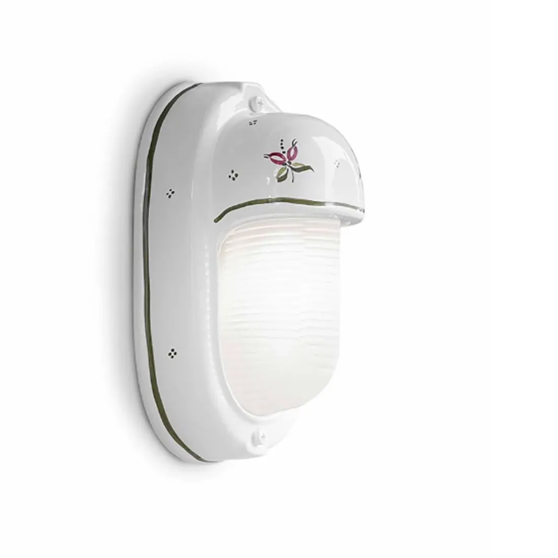 Klassische Wandlampe aus handdekorierter Keramik. Eine Applikation mit vorhersehbarer Form, die schon immer so war, sich aber von dem handdekorierten weißen Keramikdach unterscheidet, das das Licht nach unten streut. Ein Produkt Made in Italy.