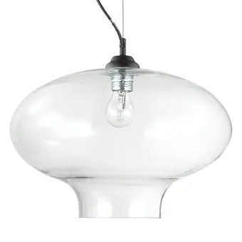 Schwarz lackierter Metallrahmen. Schwarzes gummiertes Elektrokabel. Handgefertigter Diffusor aus transparentem oder geblasenem Rauchglas. Die Pendelleuchte ist mit einer E27 60W (Halogen)- oder LED-Lampenfassung ausgestattet. Lampe nicht enthalten.