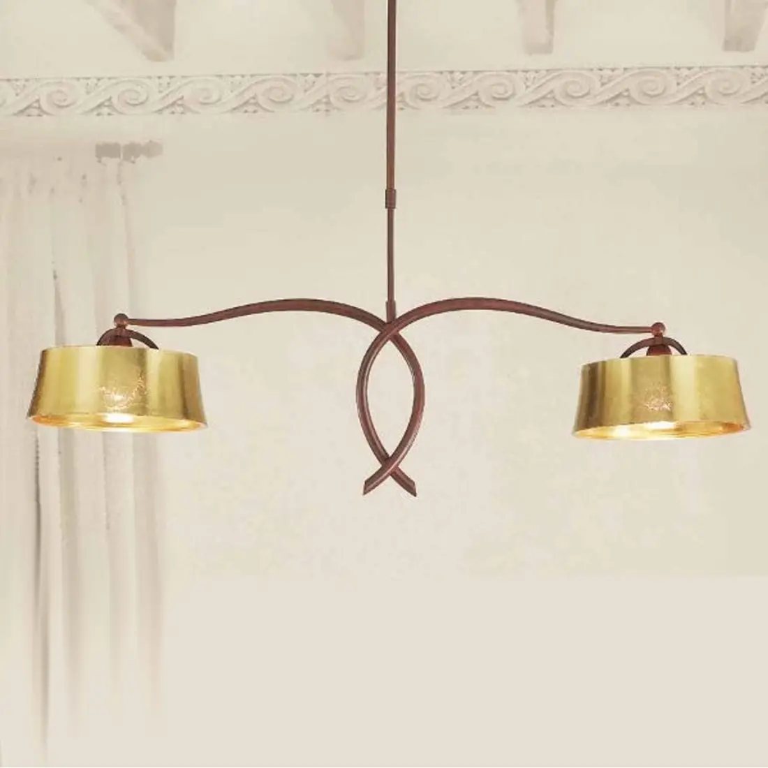 Dunkelbraun lackierte 2-Licht-Unruh, die sich durch die besondere Veredelung der Glasfarbe in von Hand von Hand aufgebrachtem Blattgold unterscheidet. Ein feines Modell für Umgebungen mit einem raffinierten Touch und auf das Minimum gepflegt. Ein Produkt Made in Italy.