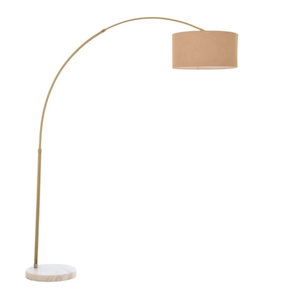 Das Design besticht durch seinen Marmorsockel, erhältlich in Weiß oder Schwarz, der Stabilität und einen Hauch von Luxus verleiht, sowie durch seinen Rahmen aus gebürstetem, galvanisiertem Gold, der für Glanz und Eleganz sorgt. Der zylindrische Lampenschirm mit einem Durchmesser von 43 cm aus haselnussfarbenem Pergament spendet ein sanftes, angenehmes Licht – ideal für eine entspannende und stilvolle Atmosphäre.