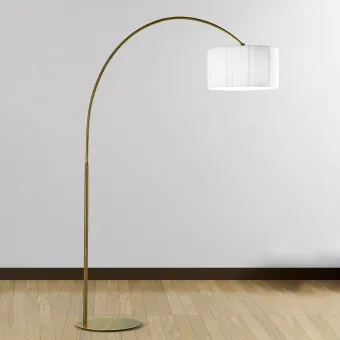 Stehleuchte mit praktischem und funktionellem Bogenarm für schwer auszuleuchtende Bereiche. Eine klassische Stehleuchte mit einem eleganten Lampenschirm aus plissiertem Stoff, der überall dort platziert werden kann, wo Licht benötigt wird oder einfach nur eingerichtet werden soll. Hergestellt in Italien.