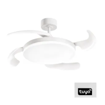 AURA 7190 BCT ist eine moderne Deckenleuchte mit Ventilator aus mattweiß pulverbeschichtetem Metall mit vier satinierten Acrylflügeln. Der Diffusor ist aus satiniertem Acryl. Mit der Funkfernbedienung (im Lieferumfang enthalten) können Sie zwischen sechs verschiedenen Geschwindigkeiten wählen und einen Timer zum Ausschalten einstellen. Dank des innovativen LED-Systems können Sie jederzeit zwischen 3000K, 4000K und 6000K Licht wählen. Ausgestattet mit dimmbaren LEDs. Kann auch mit der TUYA SMART App verwendet werden.