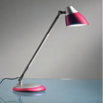 Moderne, jugendliche und farbenfrohe Schreibtischlampe zur Beleuchtung des Arbeitsbereichs für Erwachsene und Kinder. Eine LED-Quelle, die bei Berührung nicht brennt, keine Wärme abgibt und die Oberseite gleichmäßig beleuchtet.
