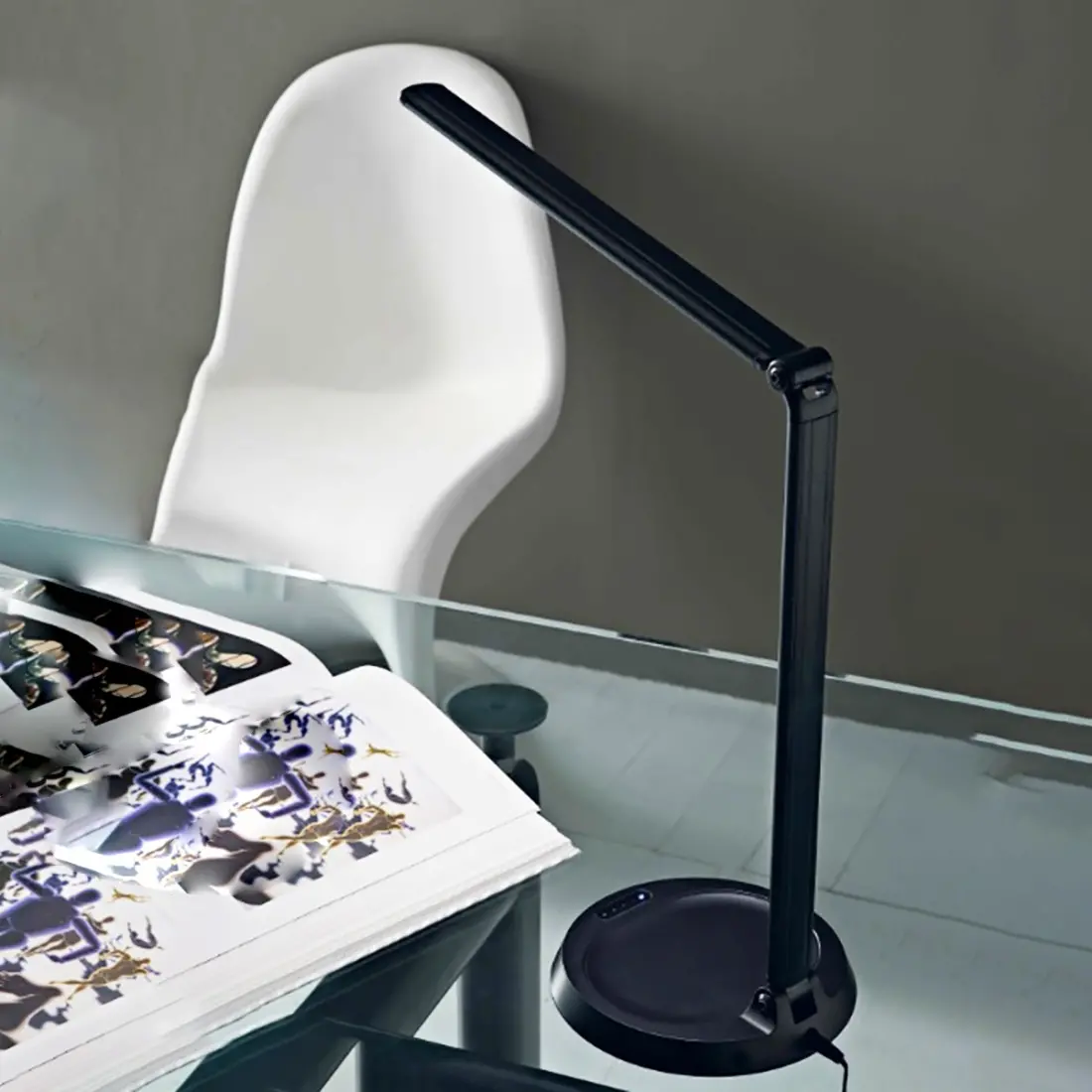 Moderne und äußerst unverzichtbare Schreibtischlampe. Eine Lampe mit LED-Lichtquelle, die dank des vollständig verschließbaren Gelenkarms nicht unübersichtlich an ihrem Standort ist.
