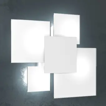 Moderne Decken- oder Wandleuchte mit geometrischer Form. Eine Decken- oder Wandlampe aus zwei verschiedenen Glasgrößen, um ein schönes und originelles Spiel im Raum zu schaffen. Eine diffuse Beleuchtung, die es Ihnen ermöglicht, der Umgebung einen Hauch von Farbe zu verleihen.
