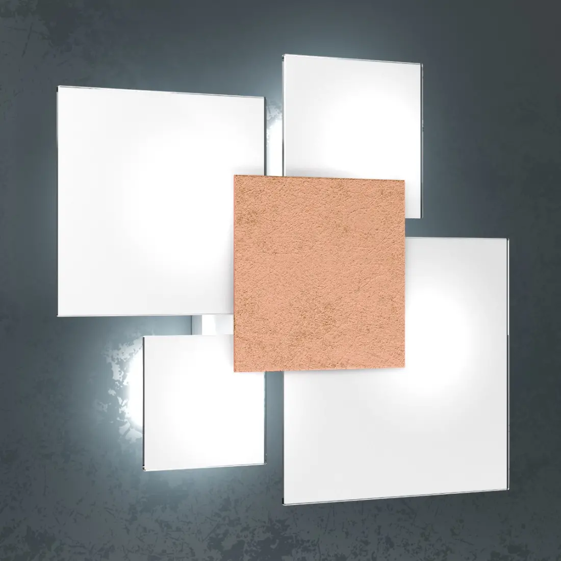 Moderne Decken- oder Wandleuchte mit geometrischer Form. Eine Decken- oder Wandlampe aus zwei verschiedenen Glasgrößen, um ein schönes und originelles Spiel im Raum zu schaffen. Eine diffuse Beleuchtung, die es Ihnen ermöglicht, der Umgebung einen Hauch von Farbe zu verleihen.