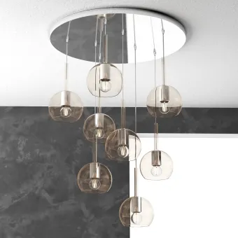 FURTURE 1155CR S8 TP besteht aus 8 geblasenen Pyrex-Glasampullen mit einem Durchmesser von 15 Zentimetern. Bei den Oberflächenveredelungen Chrom, Kupfer, Gold und Braunglas handelt es sich um Oberflächenbehandlungen, die die Lichtemission nur teilweise reduzieren. Die transparente Ausführung lässt sich selbstverständlich mit den anderen kombinieren. Die Metallstrukturen sind in den Ausführungen Chrom, Weiß und satiniertem Messing erhältlich. Eine Deckenleuchte, die in der Höhe verstellt werden kann und ein versetztes Tropfenspiel erzeugt, das der Umgebung Bewegung verleiht. Eine Deckenleuchte, die auf jeder Oberfläche oder in der Mitte des Raumes installiert werden kann.