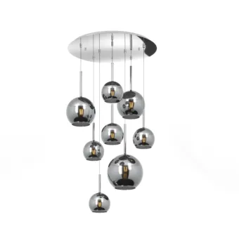 Future S8 TMIX verfügt über Glasdiffusoren mit einer Auswahl an Oberflächen; Transparent, Bernstein, Chrom, Kupfer und Gold, der Deckenbaldachin ist aus poliertem Chrom, während das Elektrokabel transparent ist. FUTURE 1155 besteht aus acht Gläsern (1 GROßES 25 cm + 2 MITTEL 20 cm + 5 KLEINE 15 cm). Die Rosette ist 60 cm groß. Der Gesamtdurchmesser beträgt 60 cm. Die Höhe kann von minimal 55 bis maximal 230 cm bewältigt werden.