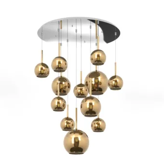 FUTURE -Deckenleuchte mit 12 Leuchten mit rundem Sockel, die Zusammensetzung umfasst (2 GROßE +2 MITTLERE +8 KLEINE) und 12 dekorative Glaskugeln. Die Deckenleuchte FUTURE zeichnet sich durch eine Optik aus, die Esprit und Verspieltheit verkörpert. Der runde Baldachin aus Metall wird durch das Licht der zwölf Leuchtmittel mit E27-Fassung akzentuiert. Das Zusammenspiel zwischen dem Licht und den hängenden Glaskugeln zieht den Blick magisch an.