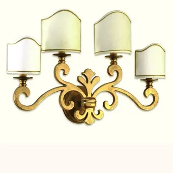 Elfenbeinfarbene Baumwollfächer (wie auf dem Foto) mit Antikgold-Finish. Die Ventilatoren sind in zwei unterschiedlichen Größen (2 x Ø 10 und 2 x Ø 13) montiert. Auf Anfrage anderer Stoff, Pongè, Shantung oder Pergament. Die Bordüre kann in hellem Gold oder in der gleichen Farbe wie der Stoff angefordert werden. Pongè ist ein Stoff, bei dem die Textur nicht zu sehen ist, daher ist er etwas eleganter; Baumwolle ist ein Stoff, bei dem man die Textur sehen kann und eher für klassische oder rustikale Umgebungen geeignet ist; Shantung hingegen ist ein raffinierterer und eleganterer Stoff. Struktur aus gealtertem Messing. Möglichkeit, die Applikation auch ohne Fächer zu haben. Die Ventilatoren werden mit einer Ringmutter, die auf die Lampenfassung geschraubt wird, an der Struktur befestigt. Die Struktur wird mit einer Halterung mit Dübeln an der Wand befestigt. Die Wandleuchte trägt vier Lampenfassungen mit E14-Fassung für Halogen-, Niedrigenergie- oder LED-Lampen. Lampen und Fischer nicht im Lieferumfang enthalten.
