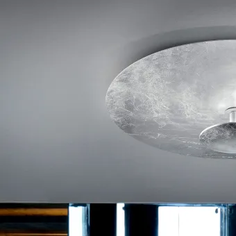 Metall lackiert in Weiß, Blattsilber oder Blattgold. Die Deckenleuchte ist mit einem 45W Warmlicht LED-Modul ausgestattet.