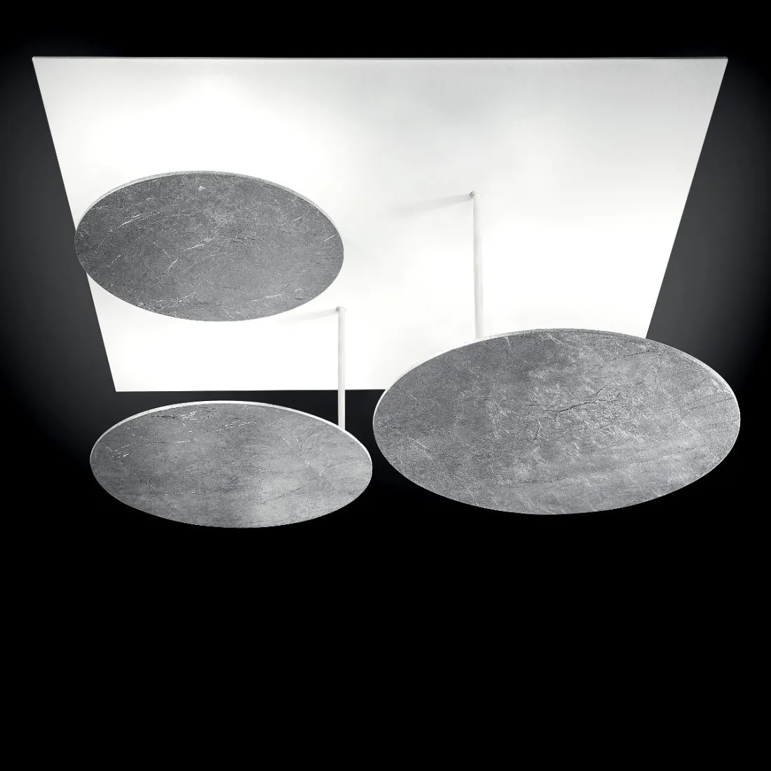 Metallrahmen mit Weiß-, Blattsilber- oder Blattgold-Finish. Die Deckenleuchte ist mit einem 45W Warmlicht LED-Modul (3000°K) ausgestattet.