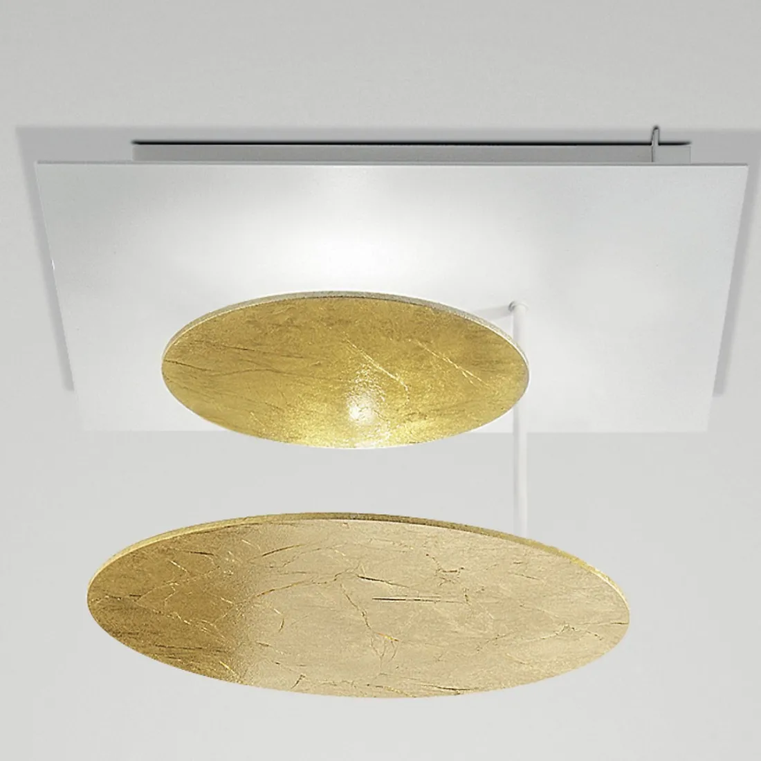 Metallrahmen mit Weiß-, Blattsilber- oder Blattgold-Finish. Die Deckenleuchte ist mit einem 40W LED-Modul mit warmem Licht (3000°K) ausgestattet.
