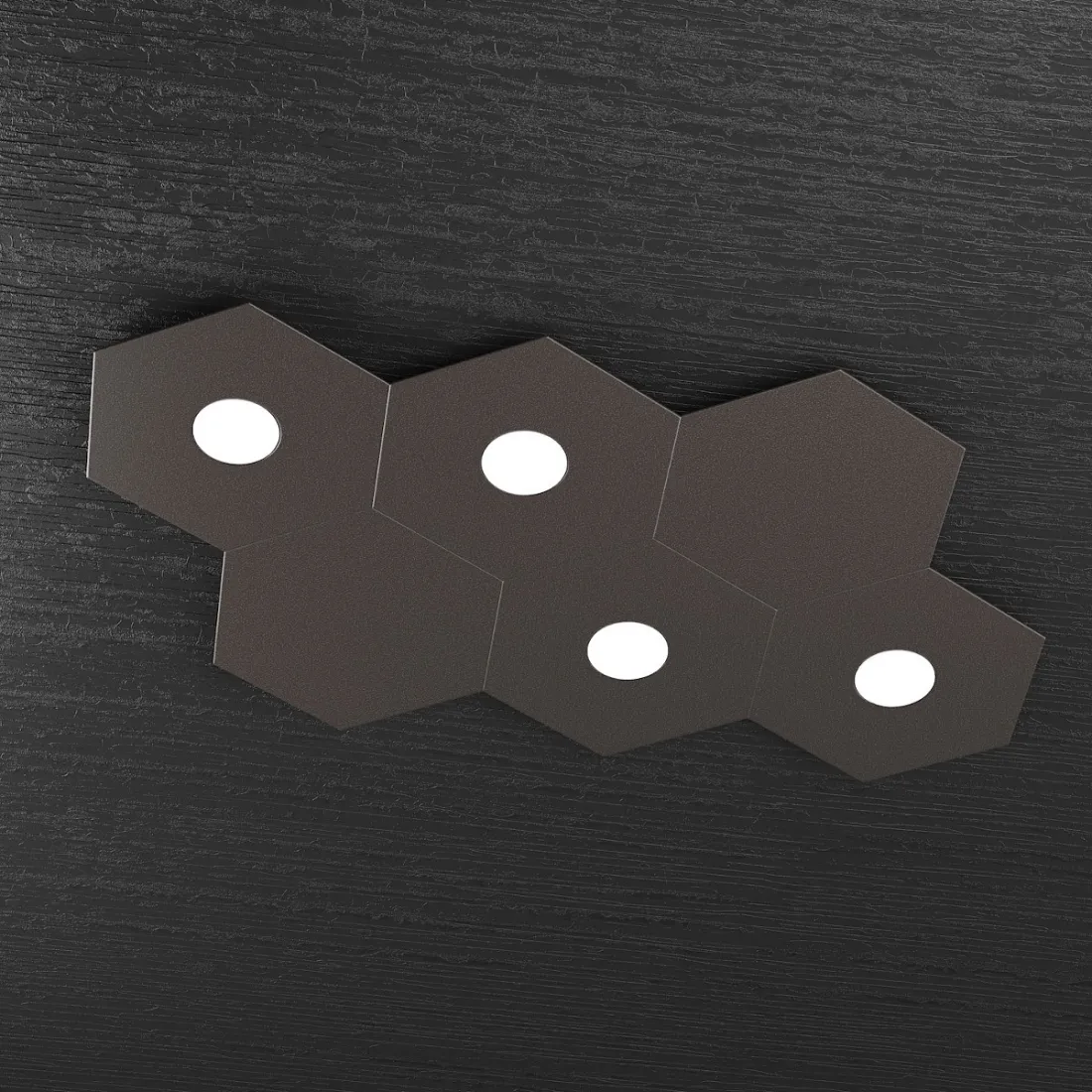 Kollektion von sechseckigen Lampen aus Metallplatten, die in verschiedenen Ausführungen lackiert sind, WEISS, GRAU, SAND, BRAUN, GRAU, ANTHRAZIT, SILBERBLATT, GOLDBLATT oder KUPFERBLATT. Die Deckenleuchte ist mit vier GX53-Lampenfassungen für max. 9W LED-Lampen ausgestattet.