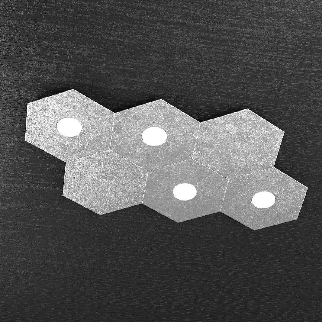 Kollektion von sechseckigen Lampen aus Metallplatten, die in verschiedenen Ausführungen lackiert sind, WEISS, GRAU, SAND, BRAUN, GRAU, ANTHRAZIT, SILBERBLATT, GOLDBLATT oder KUPFERBLATT. Die Deckenleuchte ist mit vier GX53-Lampenfassungen für max. 9W LED-Lampen ausgestattet.