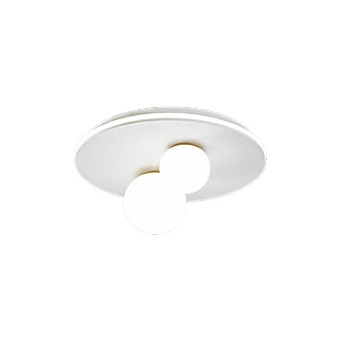 Deckenleuchte mit Glaskugeln mit diffuser Lichtemission. Eine doppelte Leuchtkraft entlang des Randes und durch die kugelförmigen Glasdiffusoren, die diese Deckenleuchte einzigartig und protagonistisch in ihrem Kontext machen.