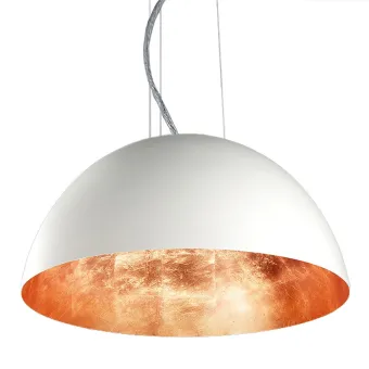 Die Aufhängung weist neben der angenehmen und besonderen Verzierung an der Außenseite auch eine ebenso einzigartige Innenseite auf: ein glattes weißes Metall, von dem das Licht durch von Hand aufgetragenes Blattsilber mehr oder weniger dekorativ reflektiert wird. Äußere Metallstruktur in Weiß (RAL9010), Schwarz glänzend, Rost, Eisen oder Taubengrau. Die Innenseite der Kuppel ist weiß gestrichen oder mit Blattsilber, Blattgold oder Blattkupfer verziert. Stahlkabel und Drähte zum Anpassen an Ihre Bedürfnisse. Die Aufhängung ist mit einem integrierten 51-W-LED-Modul mit warmen Lichttönen (3000 °K) ausgestattet. LED-Modul enthalten.