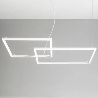 Der Kronleuchter besteht aus zwei mattweiß pulverbeschichteten Aluminiumplatten mit einem Diffusor aus satiniertem Acryl und verstellbaren Kabeln. Er ist 96 Zentimeter lang, hat eine Ausladung von 48 Zentimetern und eine verstellbare maximale Höhe von 150 Zentimetern.