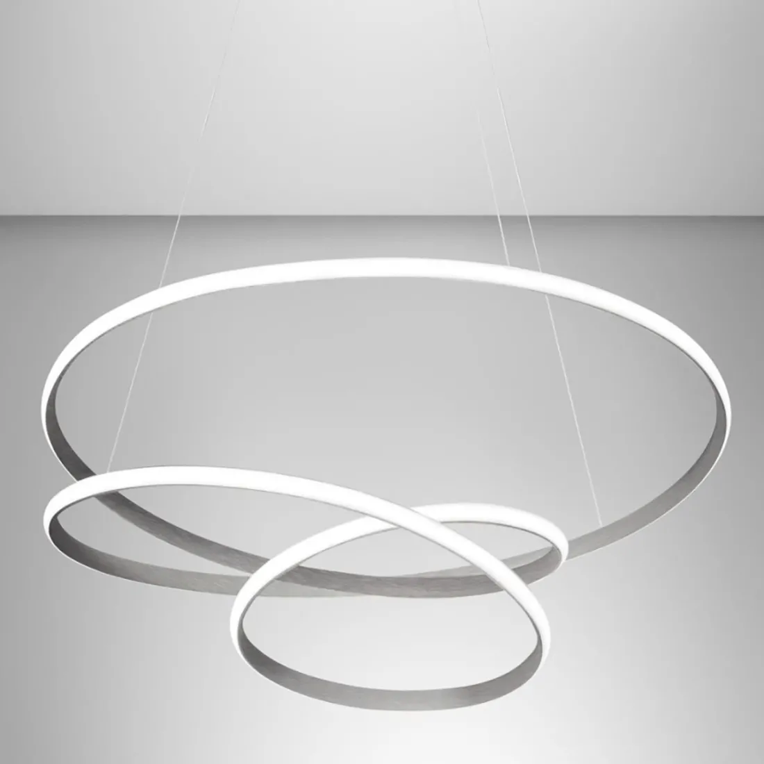 Moderner Kronleuchter mit einer originellen und weichen Form, die leicht im Raum wirbelt. Eine Aufhängung, die sich von den anderen für die Positionierung des LED-Streifens an der Außenseite des Diffusors unterscheidet, ermöglicht eine größere und diffusere Beleuchtung in der gesamten Umgebung.