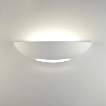 Gips-Wandleuchte TIKO mit klassischer Wannenform und nach oben gerichteter Beleuchtung. Ein dünner Schnitt im unteren Teil der Applikation, der angenehm die Form eines Lächelns annimmt und beim Anzünden auffällt. Hergestellt in Italien.