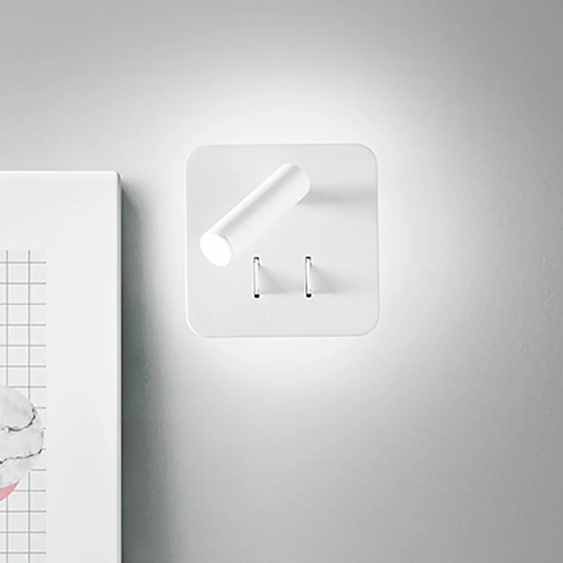 Moderne Wandleuchte mit quadratischem Sockel, auf dem ein schlichter zylinderförmiger Strahler angebracht ist, der das Licht auf einen ganz bestimmten Punkt projiziert. Eine Wandleuchte mit doppelter Funktionalität, einem Höflichkeits- und Reflexionslicht an der Wand und einem kleinen Strahler, der einen Balken beleuchtet. Eine Wandlampe auch als Nachttischlampe zu empfehlen.