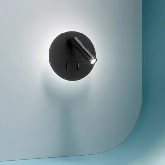 Moderne Wandleuchte mit rundem Sockel, auf dem ein schlichter zylinderförmiger Strahler angebracht ist, der das Licht auf einen ganz bestimmten Punkt projiziert. Eine Wandleuchte mit doppelter Funktionalität, einem Höflichkeits- und Reflexionslicht an der Wand und einem kleinen Strahler, der einen Balken beleuchtet. Eine Wandlampe auch als Nachttischlampe zu empfehlen.