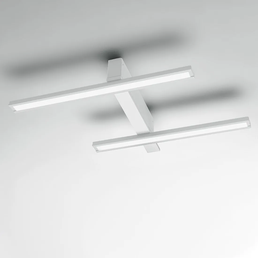Struktur aus mattweißem Aluminium. Diffusor aus Methacrylat. Die Deckenleuchte ist mit zwei Warmlicht-LED-Streifen (3000°K) ausgestattet. Auf Anfrage Tageslicht (4000 ° K). Inklusive LED-Lichtquelle mit dimmbarem Netzteil (Push). Direkte Beleuchtung. Studio & Design Giarnieri - Gea Luce.