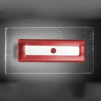 Transparenter Diffusor mit Blasen, die durch Glasschmelzen hergestellt werden, ein besonderes Verfahren, das durch die klassische Fusion von Quarzsand, Soda, Kalkstein oder Kalksteinkarbonat und all den verschiedenen Mineralien erhalten wird, um dem reinen Kristall die verschiedenen Farben zu verleihen. Rotes zentrales Glas.
