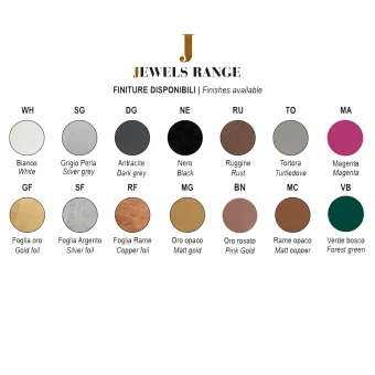- MAGENTA, BIANCO, RUGGINE, GRIGIO PERLA, ANTRACITE, NERO, TORTORA, ORO ROSATO, RAME opaco, ORO opaco, FOGLIA ORO, FOGLIA ARGENTO, FOGLIA RAME e VERDE BOSCO