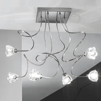 Moderne Deckenleuchte mit transparenten Blumengläsern für einen leuchtenden und leichten Effekt. Ein Modell mit einer skurrilen und geschwungenen Linie, die der Umgebung eine extravagante und jugendliche Bewegung verleiht.