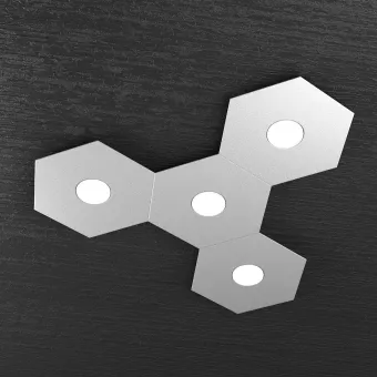 Kollektion von sechseckigen Lampen aus Metallplatten, die in verschiedenen Ausführungen lackiert sind, WEISS, GRAU, SAND, BRAUN, GRAU, ANTHRAZIT, SILBERBLATT, GOLDBLATT oder KUPFERBLATT. Die Deckenleuchte trägt vier GX53 Lampenfassungen für eine LED-Lampe von max 9W nicht im Lieferumfang enthalten.