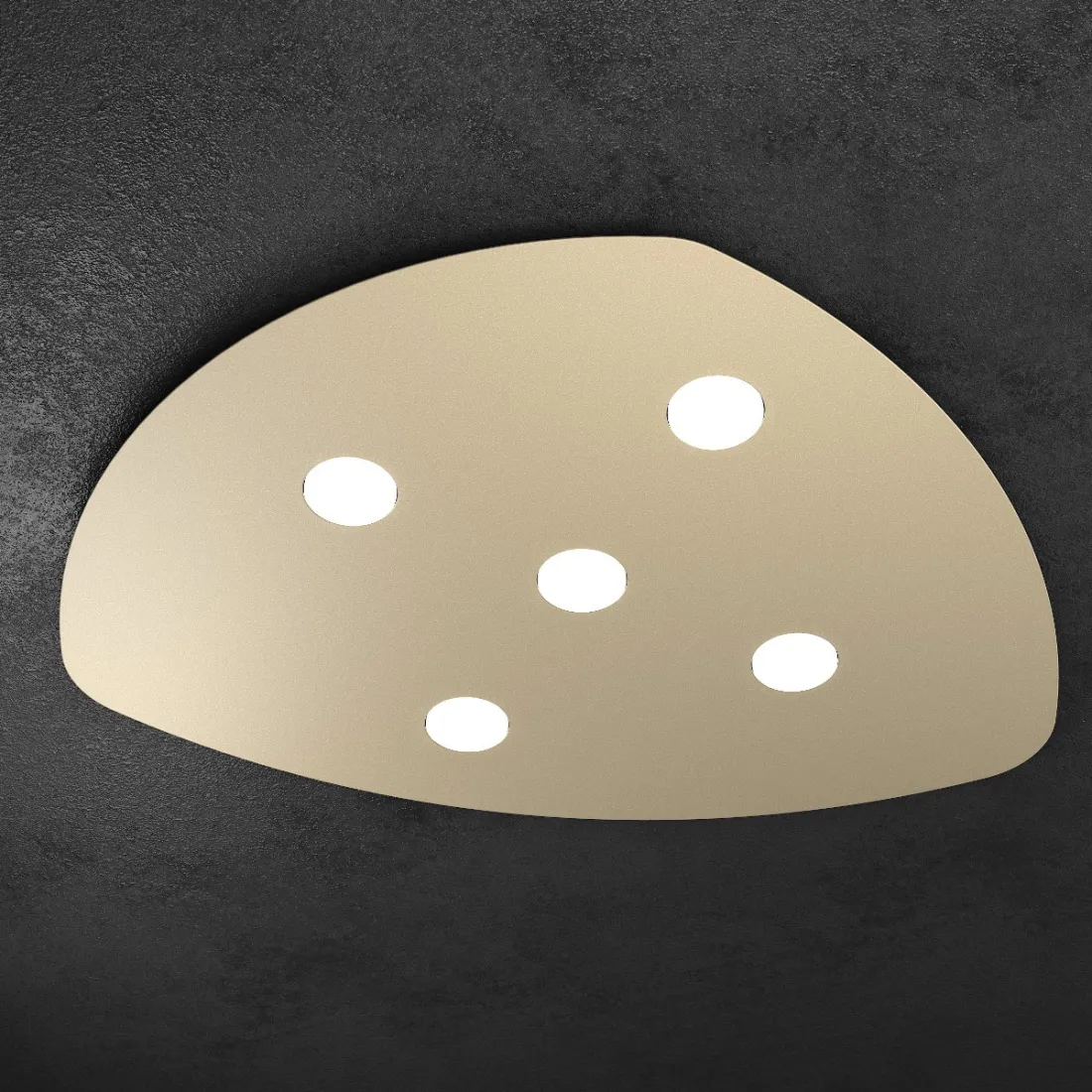 Deckenleuchte aus einer Metallplatte mit einer weichen und unregelmäßigen Form, die in verschiedenen Ausführungen (grau, sand oder weiß) lackiert ist.