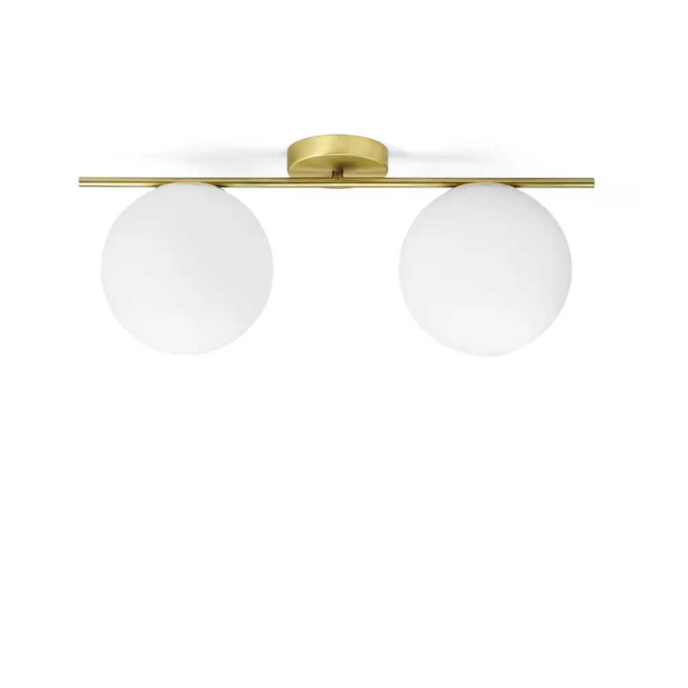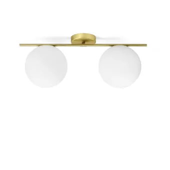 JUGEN 1744.65 zeichnet sich durch ein Design mit klaren und modernen Linien aus. Zweiflammige Deckenleuchte in Messing und Weiß mit horizontaler Halterung. Auf dem parallel zur Decke verlaufenden Metallträger montiert die Deckenleuchte JUGEN 1744.65 zwei Lampenschirme aus Milchglas nebeneinander. Das elegante Design der Deckenleuchte ist dezent, aber hochwertig. Dank ihrer Abmessungen passt die Leuchte sowohl in große Wohnräume als auch in kleinere Räume. Das diffuse Licht der blickdichten Lampenschirme trägt zur Schaffung einer einladenden Atmosphäre bei.