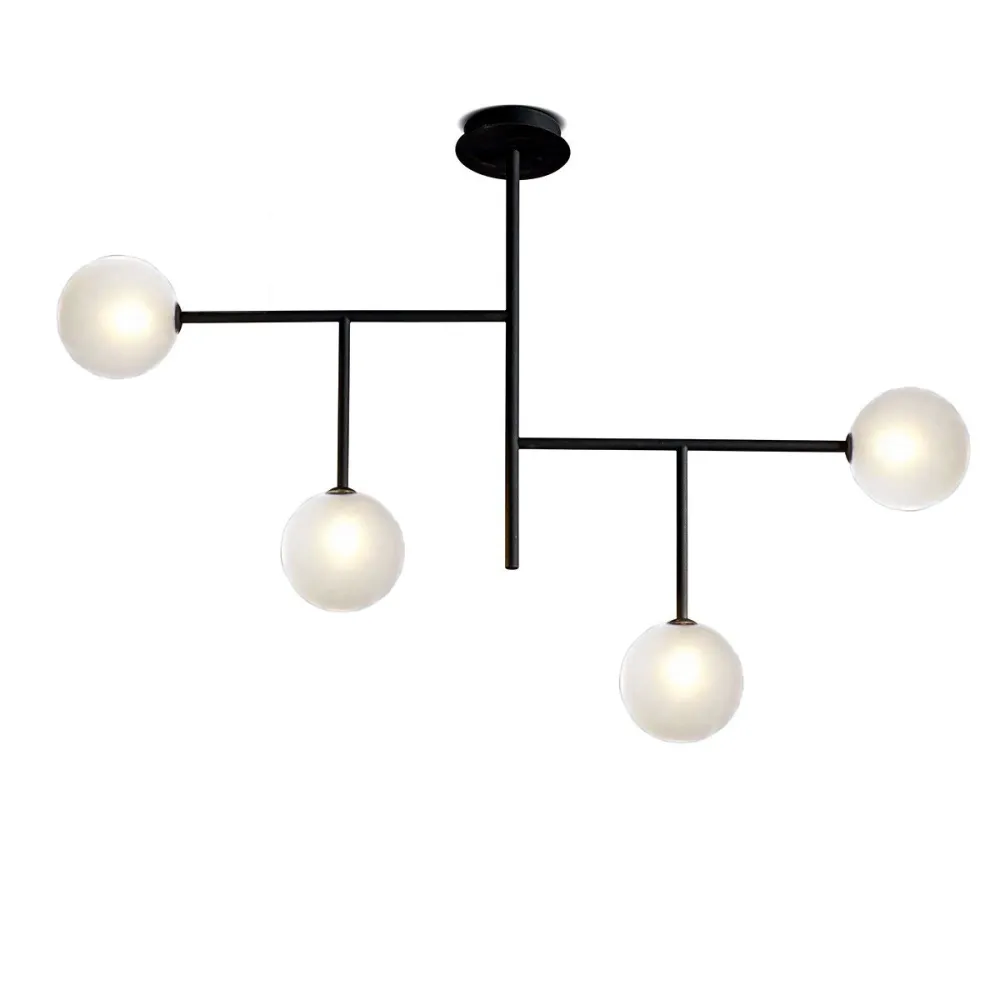 Mattschwarz lackierte Metallstruktur. Transparente Glaskugeldiffusoren mit einem Durchmesser von 12 Zentimetern. Die Deckenleuchte ist mit vier G9-Lampenfassungen für nicht im Lieferumfang enthaltene LED-Leuchtmittel ausgestattet.