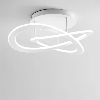 Moderne Deckenleuchte mit einer originellen und geschwungenen Form, die eine angenehme Bewegung im Raum schafft. Eine Deckenleuchte, die sich durch die Positionierung des LED-Streifens im äußeren und inneren Teil des Diffusors von den anderen unterscheidet, ermöglicht eine stärkere und homogenere Beleuchtung in der gesamten Umgebung.