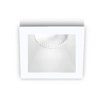 Matt weißer quadratischer Einbaustrahler zur Einrichtung und Beleuchtung von Umgebungen mit einem zeitgemäßen Touch. Spot, der an der Wand der Gipskartonplatte angebracht werden soll und sowohl für die Beleuchtung des Wohnbereichs als auch des Schlafbereichs geeignet ist.