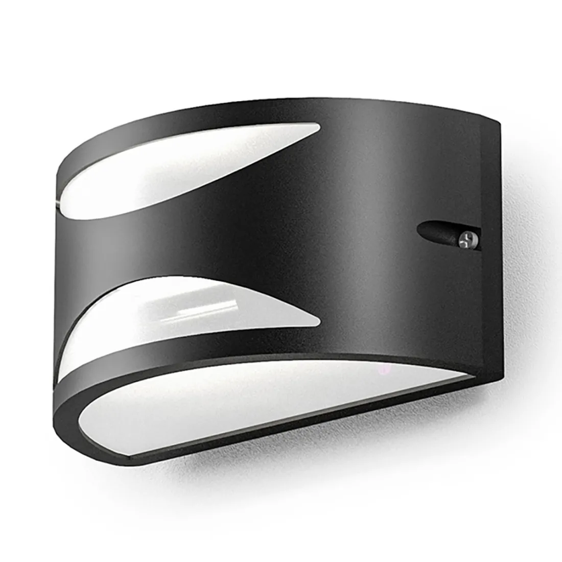 Außenwandleuchte, modern und leicht in ihrer Form, geeignet für die Beleuchtung des Außenbereichs des Hauses oder eines öffentlich zugänglichen Ortes. Eine Wandleuchte, die all ihre Seiten beleuchtet und mit schönen Lichtstrahlen versorgt.