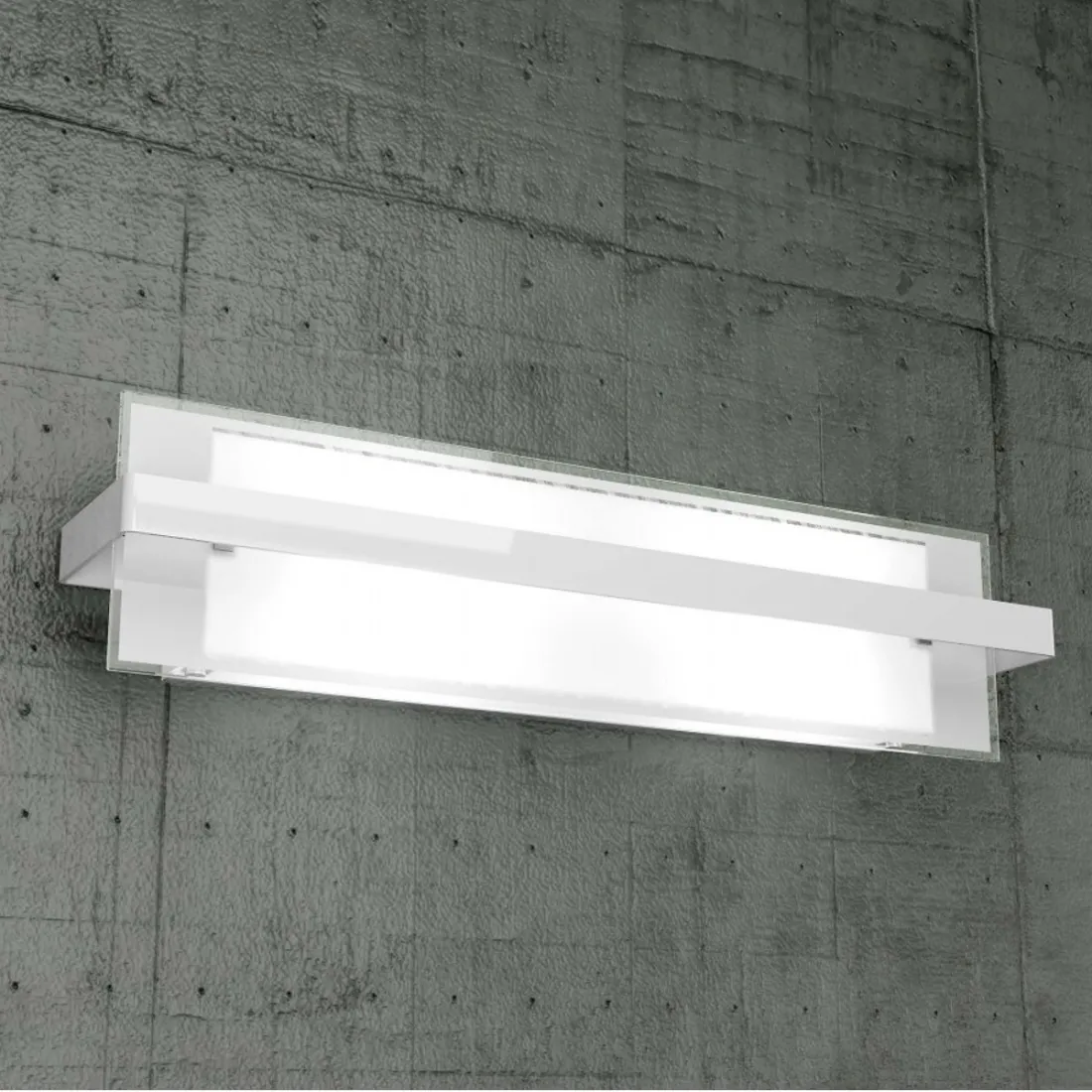 Moderne Wandleuchte aus Glas mit farbigen und dekorativen Metallbändern. Eine rechteckige Wandleuchte mit diffusem Licht, die in jedem Raum und für jeden Einsatzzweck platziert werden kann.