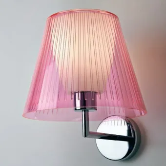 Die Wandleuchte ist mit einem verchromten Metallsockel und einem Acryl-Lampenschirm ausgestattet, der in den Farben transparent, taubengrau, lila, hellblau, rot, orange oder rosa erhältlich ist und an einen modernen Stil erinnert, der für jede Umgebung wie Eingangsbereiche, Wohnzimmer, Schlafzimmer usw. geeignet ist.