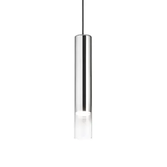 Zylindrischer Diffusor aus transparentem Glas und innen aus Metall mit polierter Chromoberfläche.