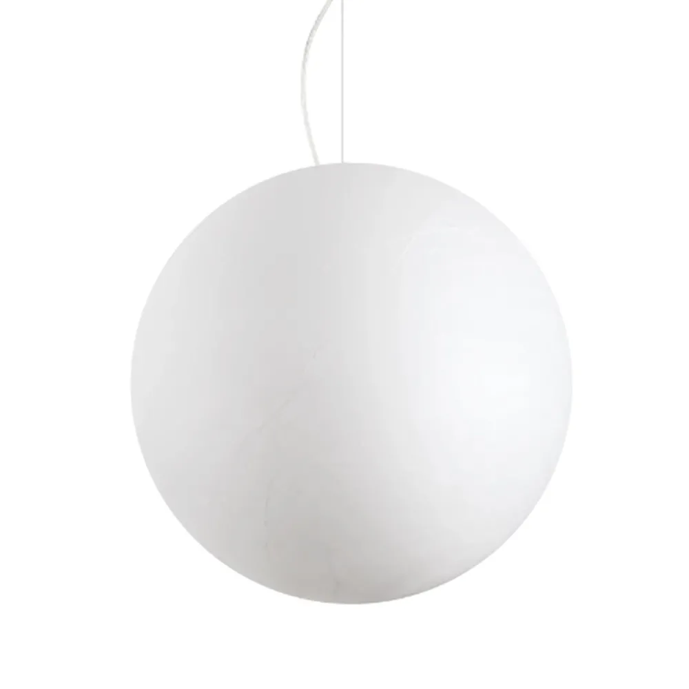 CARTA 226040 ist ein kugelförmiger Kronleuchter aus Polycarbonat, einem langlebigen, leichten und bruchsicheren Kunststoff. Die Außenfläche ist mit einem Papiereffekt-Finish behandelt bzw. beschichtet, wodurch der Diffusor ein mattes, weiches und leicht strukturiertes Aussehen erhält, ähnlich wie japanische Lampenschirme aus Papier oder Stoff.